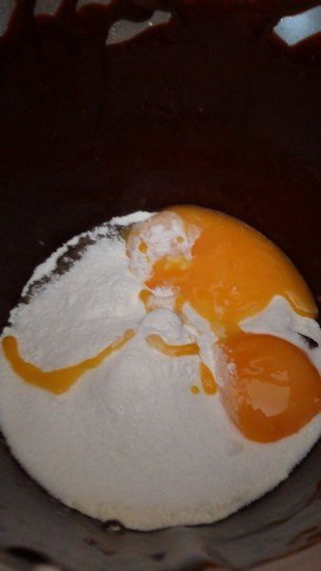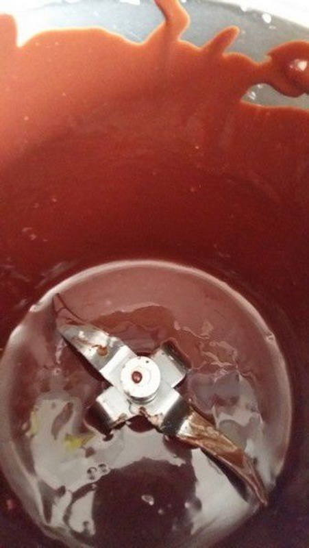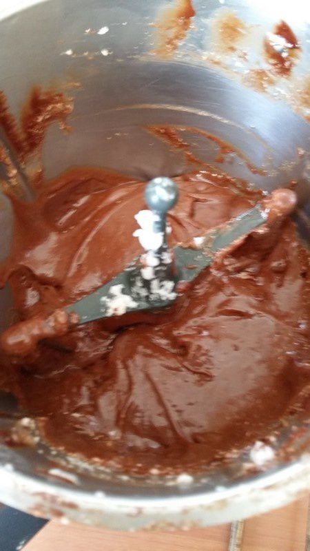 - Mettre le chocolat et le beurre coupés en morceaux dans le bol puis programmer 5min/60°C/Vit1, à la sonnerie mixer 10sec/Vit3.
