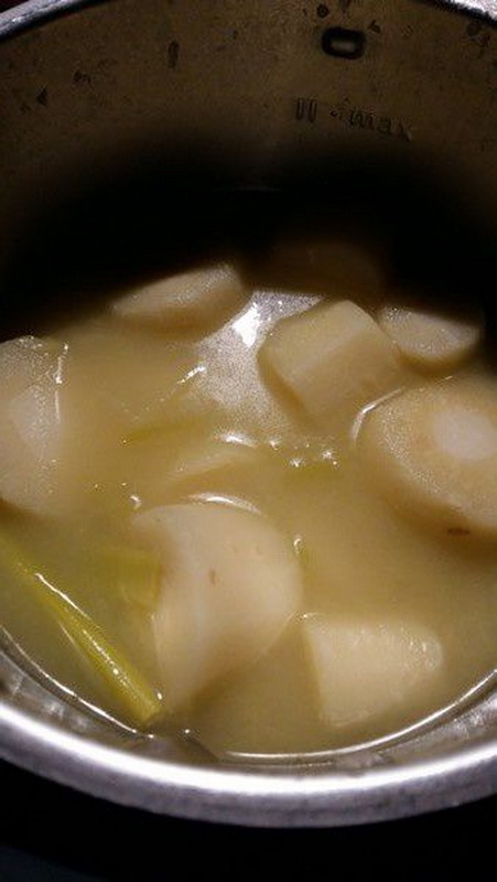 - Ajouter le poireau coupé en petits tronçons, les panais coupés en morceaux et le cube de bouillon de volaille, recouvrir d’eau environ 700g et faire chauffer 20min/Varoma/Vit1.