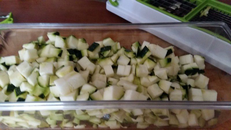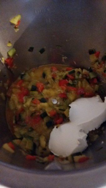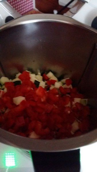 - Éplucher le poivron et les courgettes puis les tailler en brunoise. j’ai utilisé mon coupes légumes. Les mettre dans le bol avec l’huile d’olive, le sel le poivre et le piment d’Espelette pendant 20min/100°C/couteau inversé/Vit mijotage.