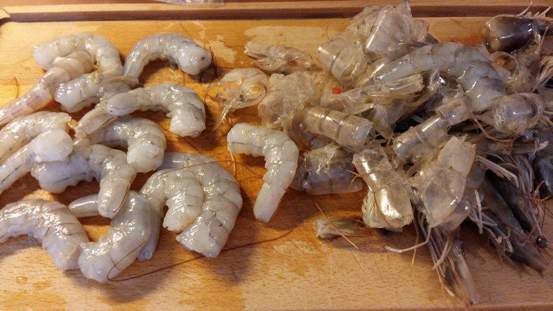 - Décortiquer les gambas en retirant la tête et le boyau, puis les couper en morceaux réguliers.