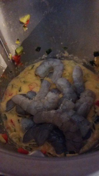 - Ajouter le mascarpone dans le bol et faire chauffer 4 min/100°C/couteau inversé/Vit mijotage sans le gobelet doseur. A la sonnerie, ajouter les gambas épluchées et continuer la cuisson 5 min/100°C/couteau inversé/Vit mijotage, si votre sauce est encore trop liquide enlever le gobelet (le jus peut être plus ou moins liquide selon l’eau que les courgettes ont rendu.)