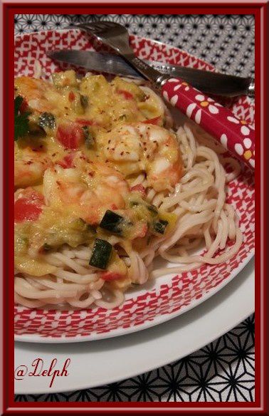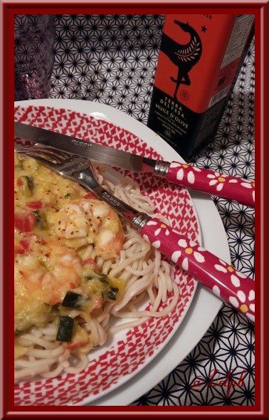 A la maison, nous aimons beaucoup les pâtes, mais pour changer, j’avais envie de cuisiner des nouilles japonaises, il me restait un peu de légumes et des Gambas, j’ai improvisé un petit plat pour faire plaisir à tout le monde.