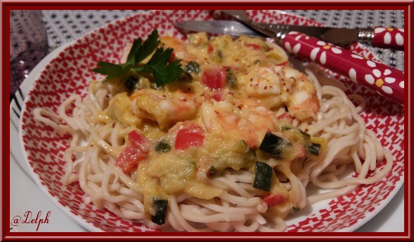 - Servir aussitôt en mélangeant les pâtes avec la sauce et les gambas.