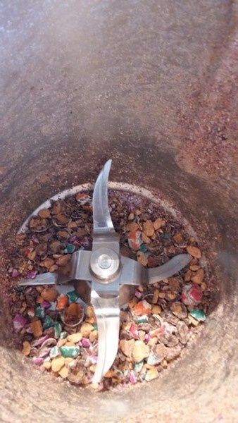 - Mettre les M&M’s dans le bol et mixer 5sec/Vit5 (attention aux oreilles fragiles), réserver dans un bol.