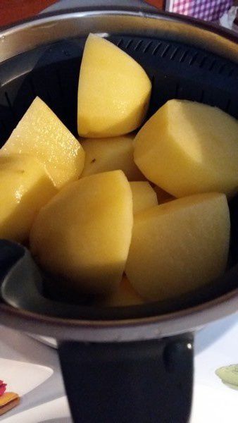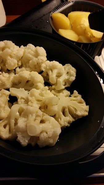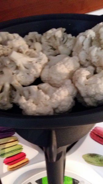 - Nettoyer le chou-fleur en retirant les feuilles et les côtés, séparer les bouquets et les laver, éplucher et laver les pommes de terre, mettre les pommes de terres dans le panier cuisson et les bouquets de chou-fleur dans le Varoma, installer le panier cuisson avec les pommes de terre dans le bol avec 800g d’eau, mettre le couvercle et installer le Varoma, puis programmer 30min/Varoma/Vit1, à la sonnerie enlever le panier cuisson avec les pommes de terre, si vos bouquets de chou-fleur sont encore trop fermes allonger la cuisson 10min/Varoma/Vit1. A la sonnerie, enlever la Varoma. Réserver les pommes de terre et le chou-fleur.