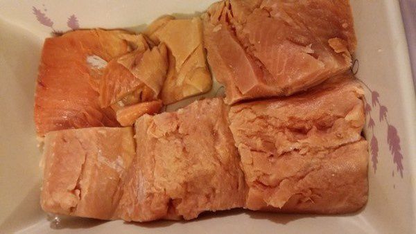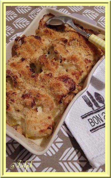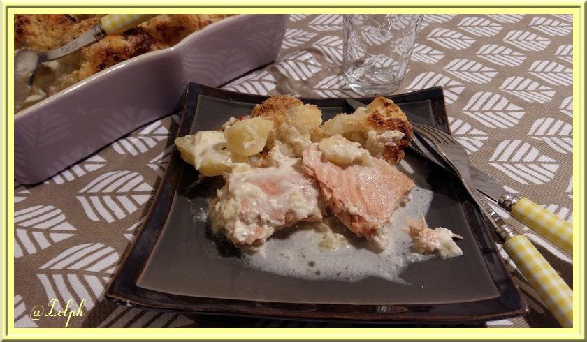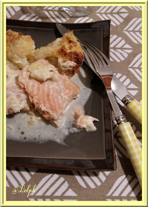 - Graisser un plat à gratin, couper le saumon en lamelles et le disposer dans le plat, le recouvrir de lamelles de pomme de terre, saler et poivrer, couvrir avec le chou-fleur à la crème.