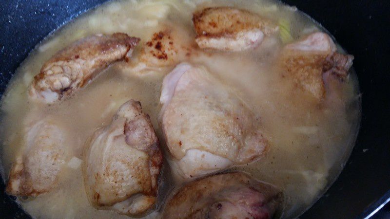 - Mettre vos oignons ciselés et les faire suer, singer (ajouter la farine) et mélanger, mouiller avec le fond de volaille à hauteur, porter à ébullition, écumer, saler, remettre la volaille, ajouter le reste de fond de volaille à hauteur puis cuire à feu doux moyen pendant environ 20min.