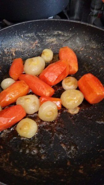 - Éplucher les oignons grelots et les carottes, les mettre dans une casserole avec de l’eau à hauteur, du beurre et du sucre, faire cuire à feu doux jusqu’à évaporation de l’eau, faire caraméliser en remuant régulièrement.