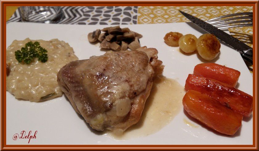 - Sortir la volaille du jus et passer la sauce au chinois, crémer puis remettre la sauce sur la volaille, dresser avec les champignons, carottes et oignons grelots.