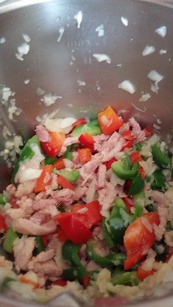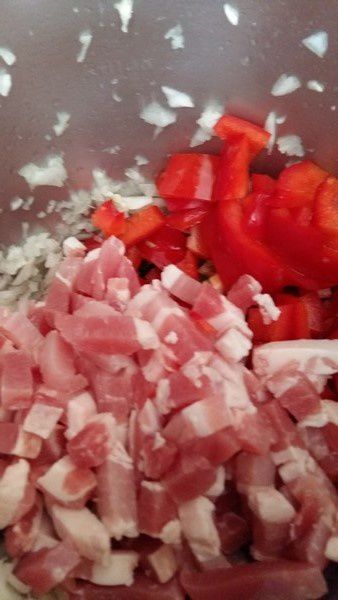- Dans le bol, mettre l’oignon coupé en 2 et mixer 5 sec/vit 5. Ajouter les poivrons coupés en dés et les lardons puis faire revenir 4 min/100°C/sens inverse/vit mijotage.