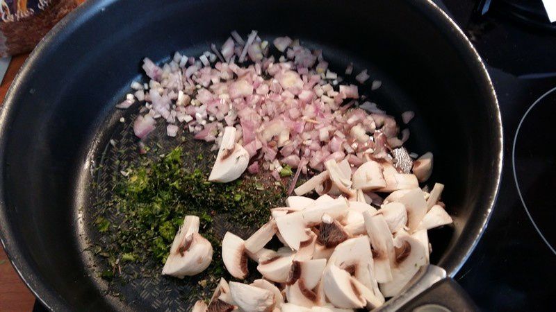 - Beurrer un sautoir, ajouter l’échalote, le persil et les champignons, le sel et le poivre.