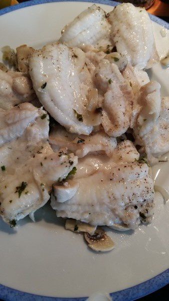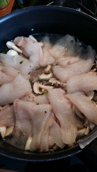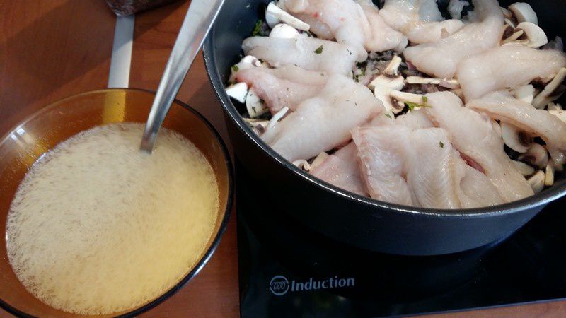 - Disposer par dessus les filets de sole, pliées en deux, ajouter le vin blanc, puis ajouter le fumet de poisson froid à hauteur.
