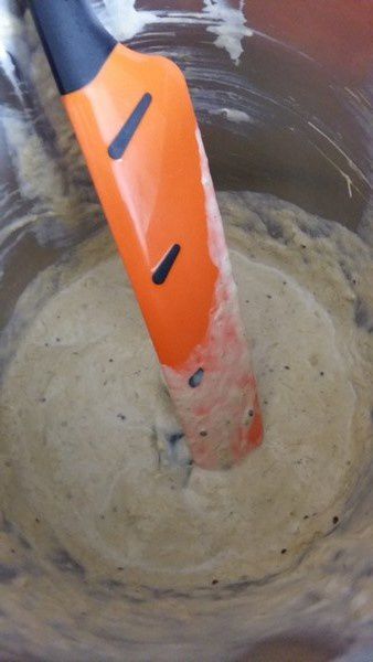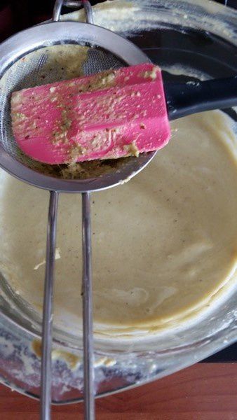 - Tamiser le mélange lisse ainsi obtenu dans un saladier (s’aider d’une maryse pour presser la pâte).