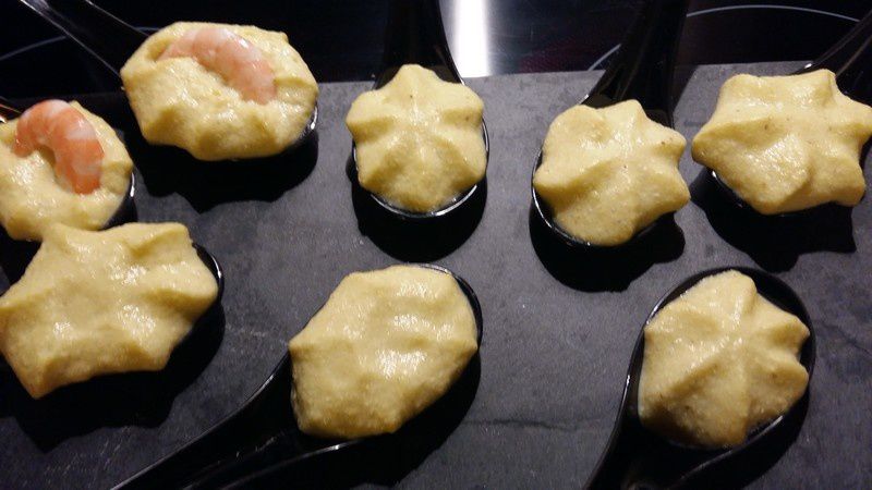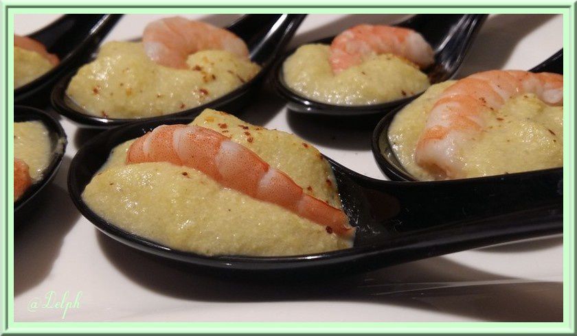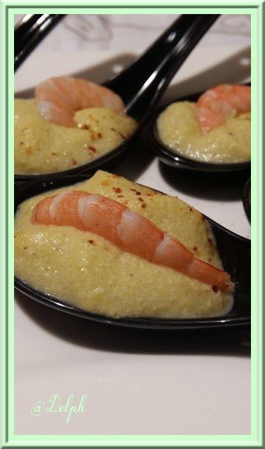 - Au moment de servir, secouer le siphon et répartir l’Espuma d’asperges sur les cuillères, puis mettre une crevette par dessus et saupoudrer d’un peu de piment d’Espelette.