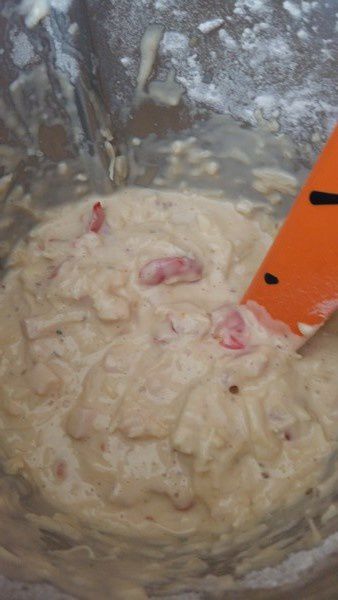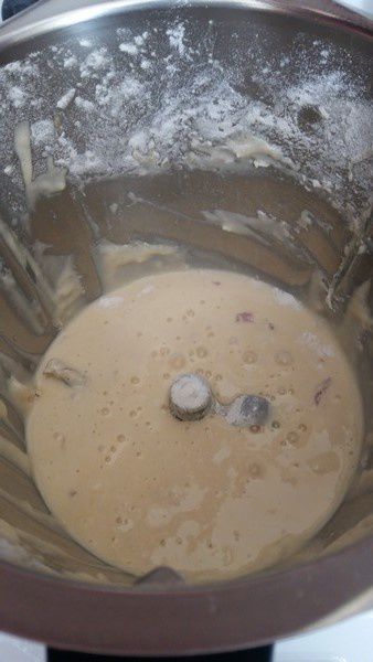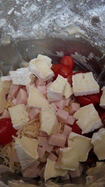 - A la sonnerie, ajouter la la farine, la levure, les œufs, le lait le sel, le poivre et le basilic puis mélanger 20sec/Vit4, et pour finir ajouter le camembert, le jambon, les tomates cerises l’Emmental et mélanger 20sec/couteau inversé/Vit 3.