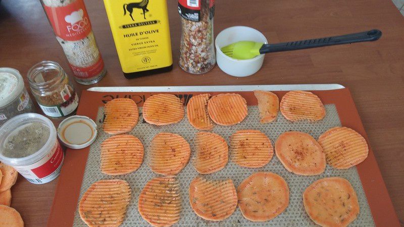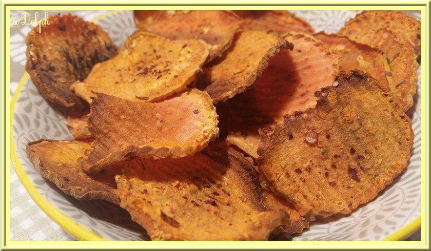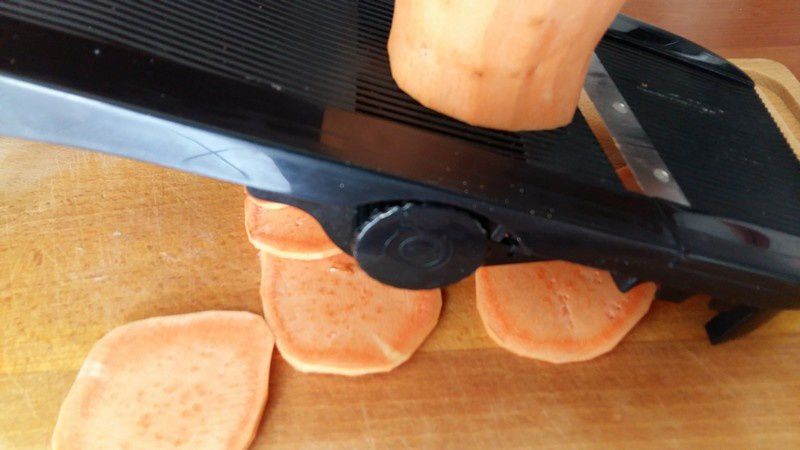 Lorsque j’ai vu cette recette chez Isabelle sur son blog « Quelques grammes de gourmandises », j’ai voulu tester car il me restait un peu de patate douce. Me voici en cuisine, armée de ma mandoline, pour préparer une petite gourmandise pour nos petits apéros.