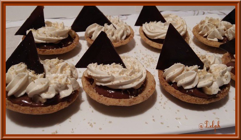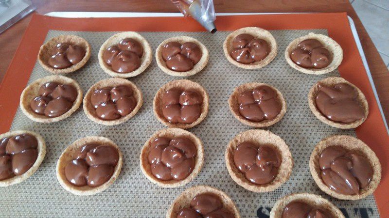 - Pocher le crémeux chocolat caramel dans les tartelettes, mettre quelques noisettes caramélisées.