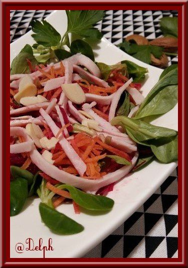 - Assaisonner. Ajouter la mâche, les carotte les betteraves, les lanières de blanc de dinde, mélanger et rectifier assaisonnement si nécessaire.