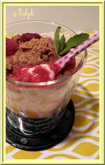 Lorsque j’ai vu ces petits desserts chez Vanda, j’ai tout de suite été tentée….Vanda les propose à la compote de rhubarbe et bananes mais n’ayant pas de banane sous la main j’y ai mis des framboises…C’est un petit régal.