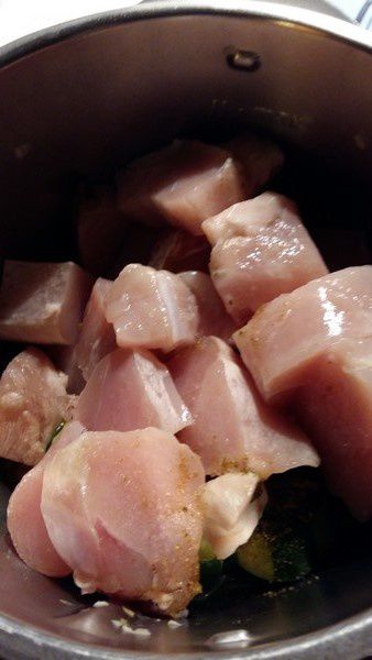 3. A la sonnerie ajouter le poulet coupé en gros dés, les pignons de pin, le sel, le poivre et le cumin puis continuer la cuisson 10min/100°C/couteau inversé/Vit mijotage.