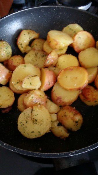 - Faire cuire vos pommes de terre à l’eau bouillante pendant 10 minutes environ, les égoutter, les éplucher et les couper en grosses rondelles, les faire revenir dans une poêle avec du beurre et du persil haché.