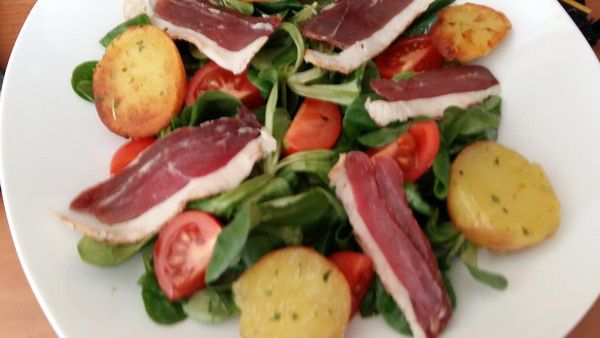 - Mettre votre salade de mâche dans votre assiette, disposer vos tranches de magret séchés, couper vos tomates cerises en deux ou en 4 selon leur grosseur, les disposer autour des magrets.