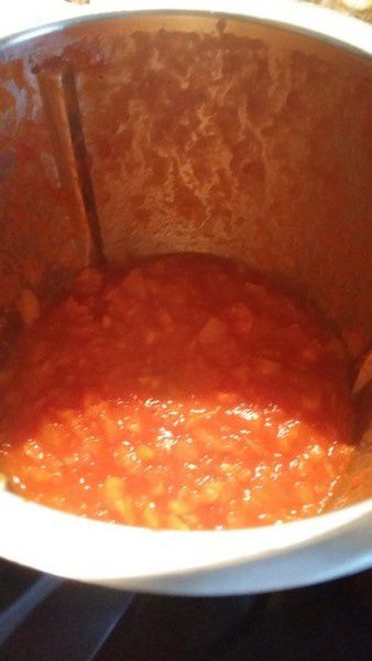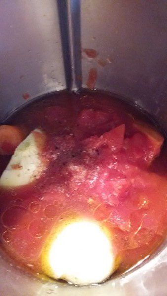 - Mettre les oignons, la gousse d’ail, les carottes, l’huile d’olive, le vin blanc, les tomates, le poivre, le sel et l’eau dans le bol et mixer 5sec/Vit5. Puis cuire 15min/Varoma/vit1.