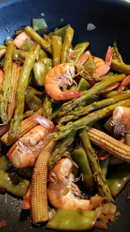 - Ajouter les épis de maïs et les crevettes, puis la sauce soja ,l’eau , et la pâte de curry, assaisonner, laisser de nouveau à feu doux , jusqu’à ce que vos légumes soient cuits mais encore croquants , vous pouvez rajouter un peu d’eau et de sauce Soja.