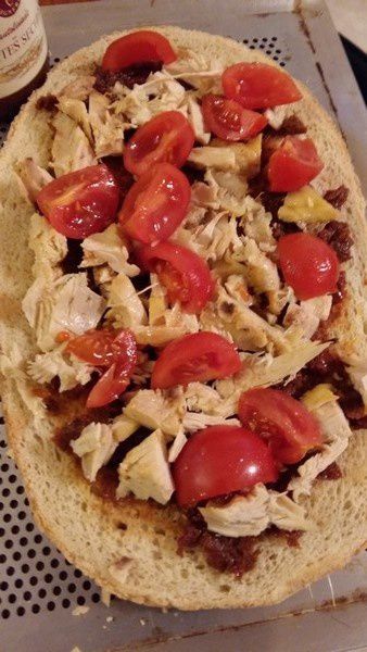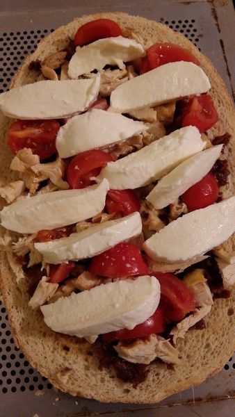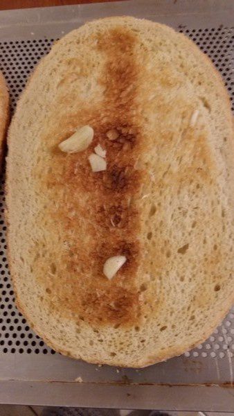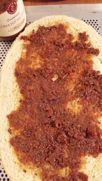 - Mettre votre tartine, au grille pain, frotter la avec un peu d’ail, appliquer en fine couche votre purée de tomates séchées.