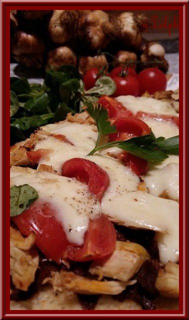 - Couper en dés votre poulet et le parsemer sur la purée de tomates, découper en quartiers les tomates cerises les ajouter entre les morceaux de poulet.