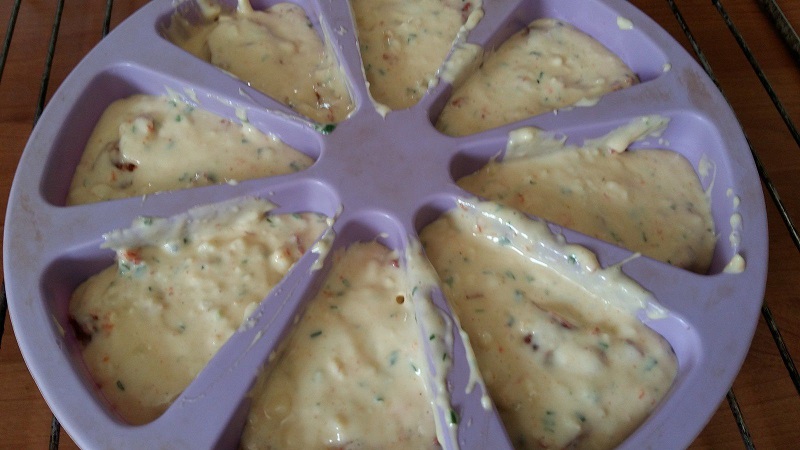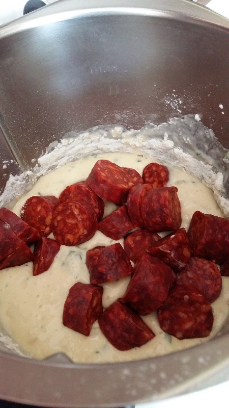 - Mélanger dans un saladier les œufs, le lait, ajouter la farine, la levure la ciboulette et mélanger à nouveau, incorporer le Comté et les rondelles de chorizo.