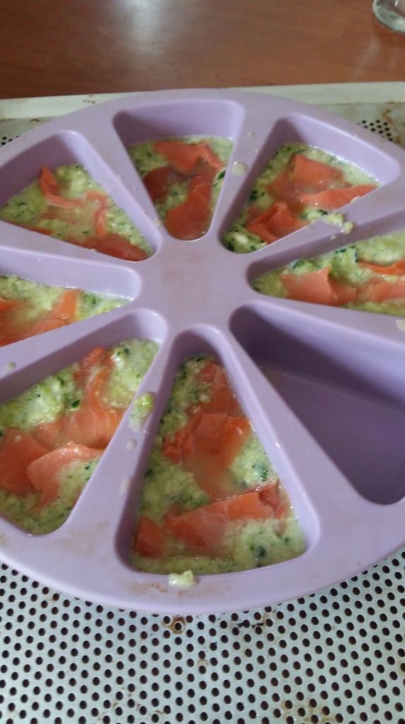 - Mettre le tout dans des moules à muffins, ou minis moules à cakes, découper des lanières de votre truite fumée puis intégrer dans chaque portion une ou deux manières.