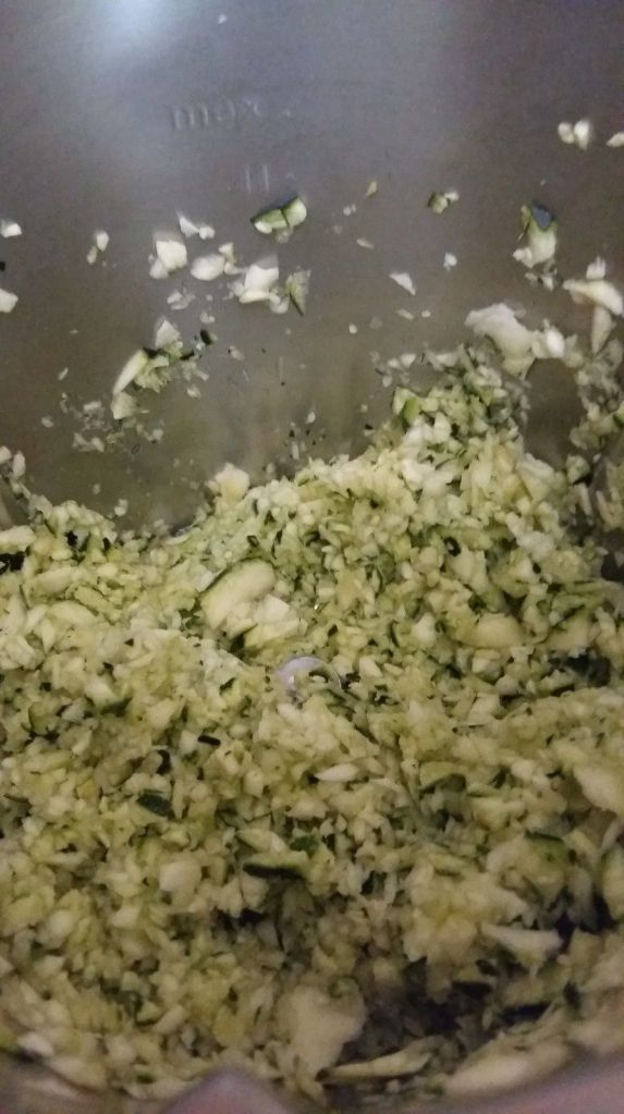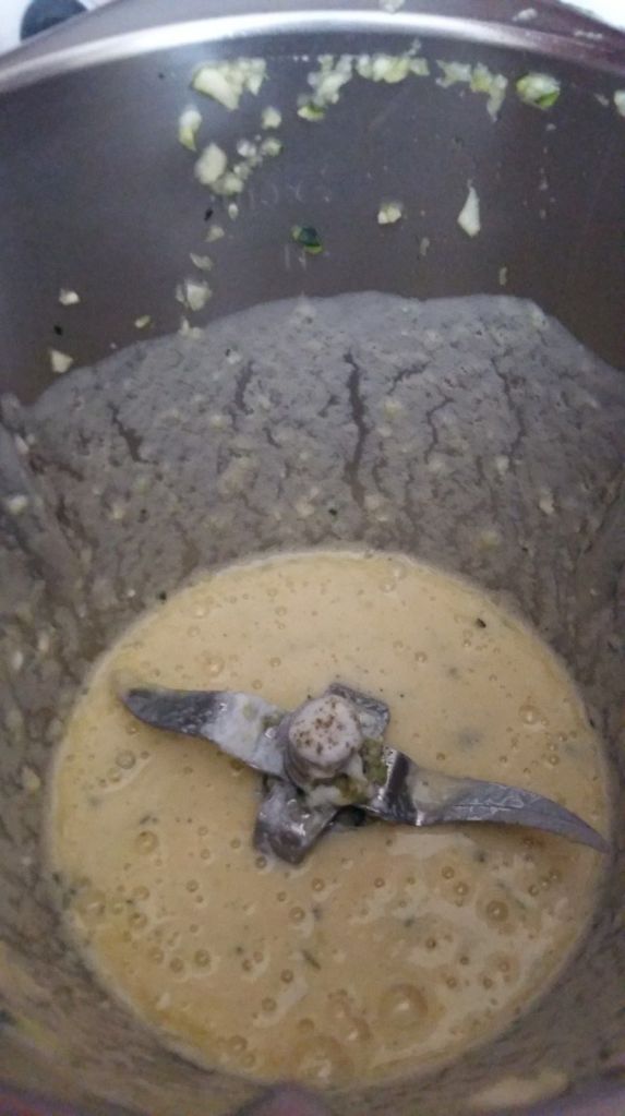 - Éplucher, laver vos courgettes, les couper en grosses rondelles, éplucher et dégermer vos gousse d’ail, tout mettre dans le bol et mixer 10sec/Vit5.