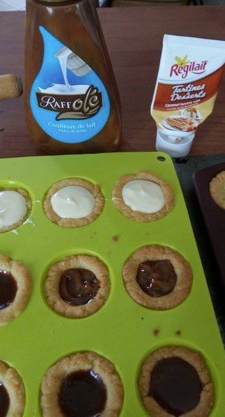 - Sans démouler les sablés, remplir le creux des sablés de caramel (environ 1/2 cuillères à café), de confiture de lait ou de Nutella.