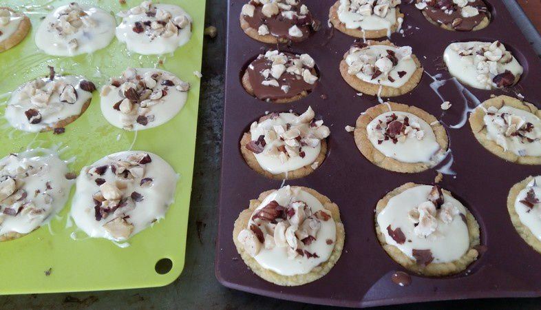 - A l’aide d’une cuillère, recouvrir les sablés de chocolat fondu et parsemer de noisettes torréfiées et concassées.