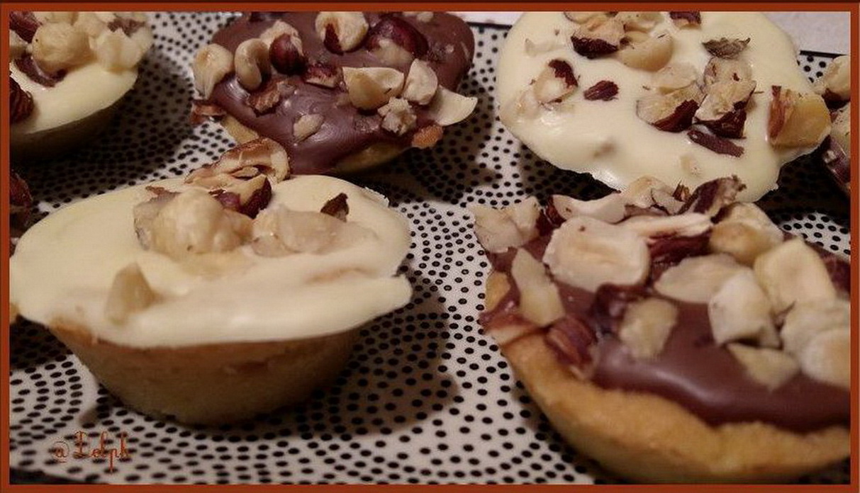 C’est simple et rapide à faire, il y a une base de pâte sablée, puis on couvre de caramel au beurre salé, ou Nutella, ou confiture de lait..Un peu au goût de chacun, puis on recouvre d’une couche de chocolat noir ou blanc et on parsème de noisettes….Oh le régal…Ils n’ont pas fait long feu.