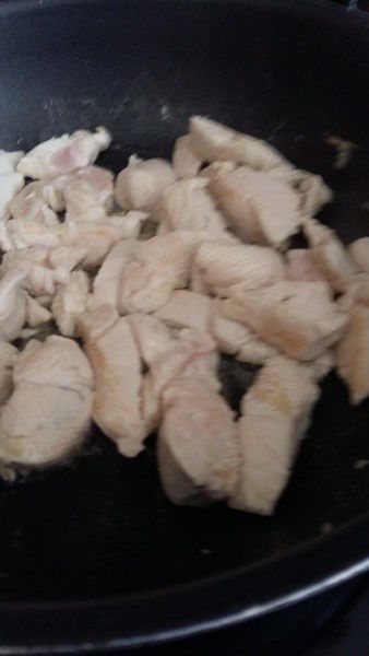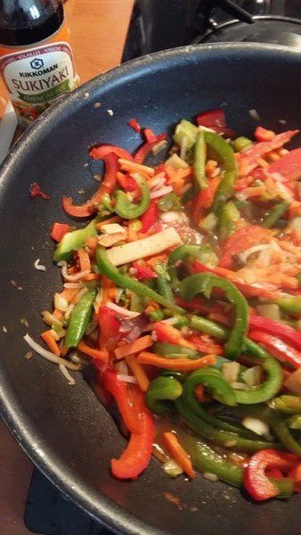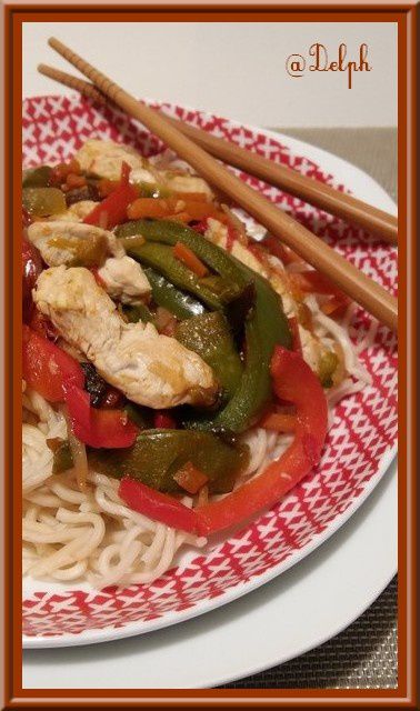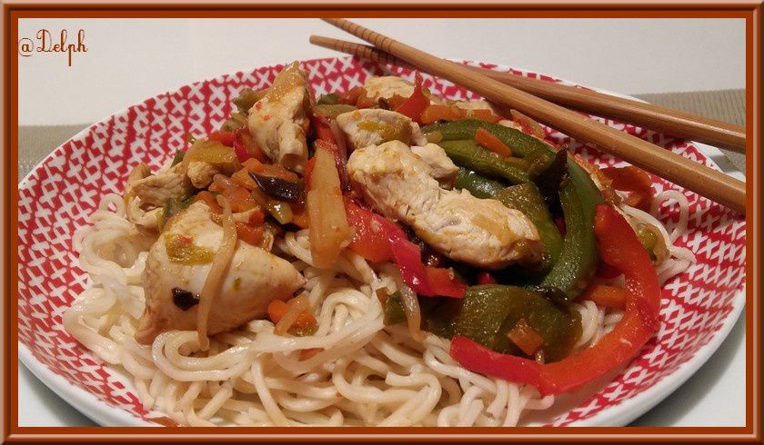 - Enlever les blancs de poulet puis mettre à la place la julienne de poivrons et les légumes, assaisonner de sauce Teriyaki (4 c à soupe), faire revenir une vingtaine de minutes.