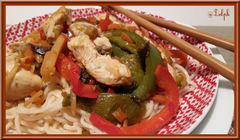 - Enlever les blancs de poulet puis mettre à la place la julienne de poivrons et les légumes, assaisonner de sauce Teriyaki (4 c à soupe), faire revenir une vingtaine de minutes.