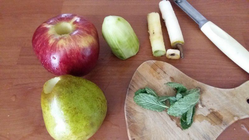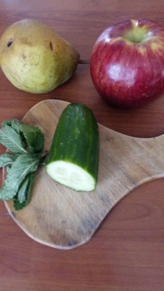 - Laver votre pomme et votre poire, enlever le cœur (cela n’est pas obligatoire), enlever la peau du concombre.