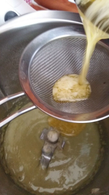 - .Incorporer le beurre fondu, passer le à travers une passoire pour enlever toutes les impuretés, puis mélanger à nouveau 20sec/Vit3.