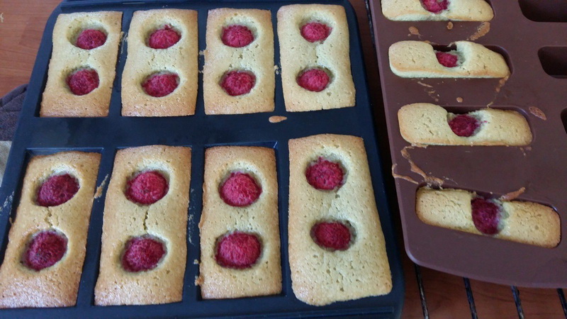 - Repartir cette préparation dans les moules à financiers. Enfoncer légèrement 2 ou 3 framboises.
