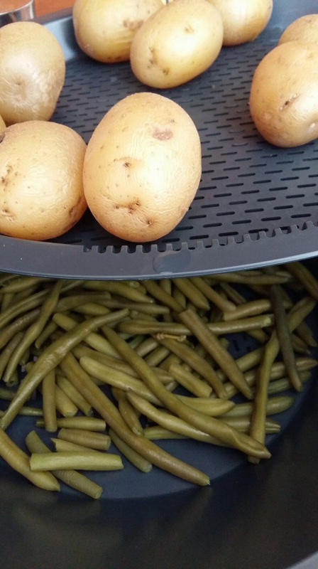 - Mettre l’eau dans le bol du Thermomix avec un cube de légumes, placer les haricots verts dans le varoma et mettre des pommes de terre lavées mais non épluchées sur le panier Varoma du deuxième étage, fermer avec le couvercle