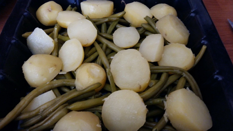 - Laisser refroidir le tout, éplucher et couper les pommes de terre en lamelles, mettre les haricots et les pommes de terre au fond du plat. J’ai utilisé mon moule tablette.