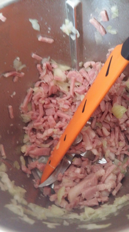 - Éplucher votre oignon, le mettre dans le bol nettoyé et mixer 5sec/Vit5, ajouter les lardons et faire cuire 4 min/90°C/couteau inversé/vitesse mijotage, ajouter cette préparation sur les pommes de terre et haricots verts.
