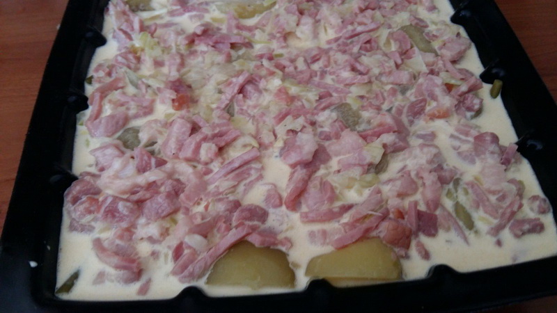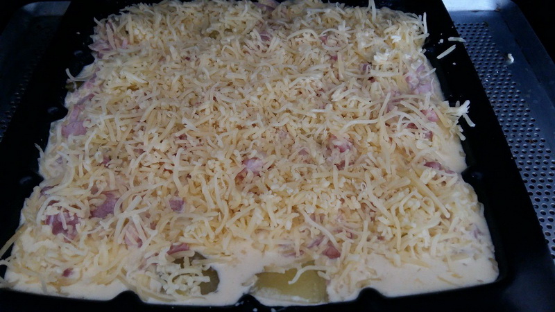 - Recouvrir les légumes et les lardons avec ce liquide, parsemer de comté râpé puis enfourner entre 30 et 35 minutes.