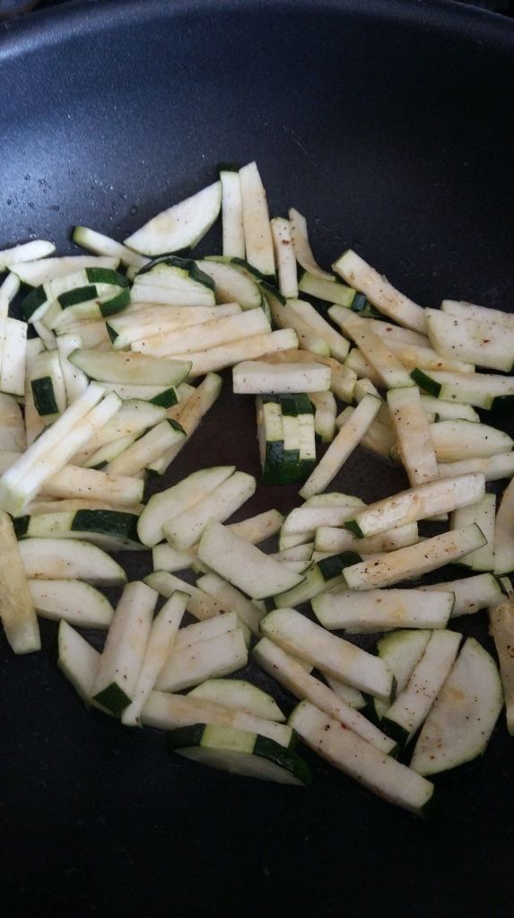 - Faire chauffer votre poêle. Verser une larme d’huile d’olive. Ajouter vos bâtonnets de courgette. Saler poivrer.