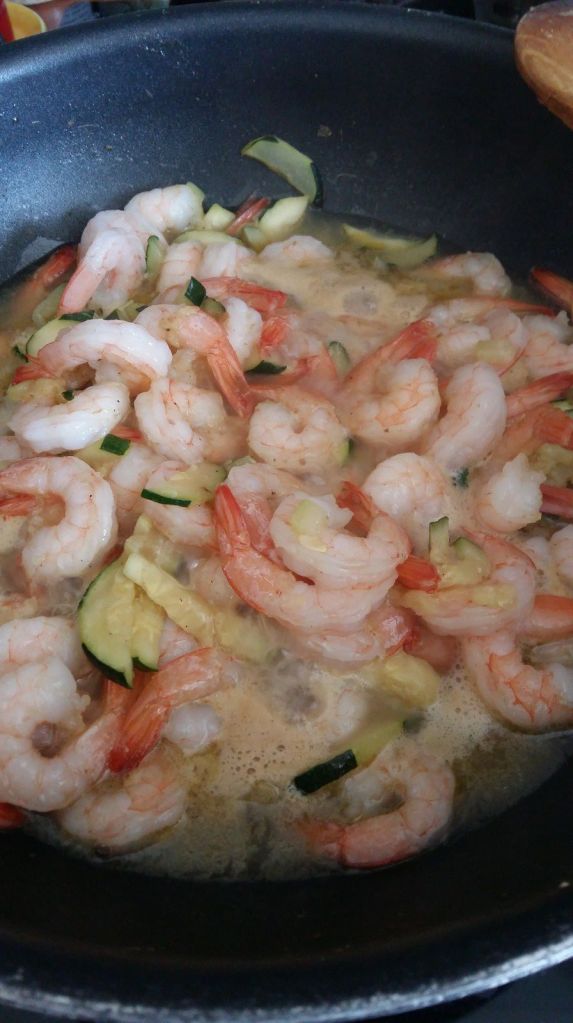 - Décortiquer vos crevettes. Laver votre courgette et la couper en petits bâtonnets.