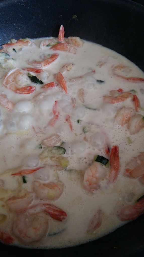 - Cuire 5 minutes sur feu assez vif. Mettre vos crevettes, gingembre et curry. Mélanger pour éviter que cela n’attache. Verser le lait de coco et baisser le feu….
