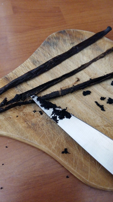 - Fendre les gousses de vanille en deux et récupérer les grains avec la pointe d’un couteau.