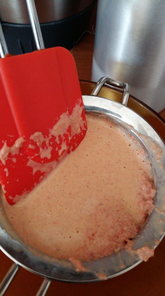 - Mixer la crème et les rondelles de chorizo. Transvaser cette crème dans un siphon en la passant au tamis pour filtrer. Il est important qu’il n’y ai pas de morceaux dans la préparation. Ces derniers boucheraient le siphon…